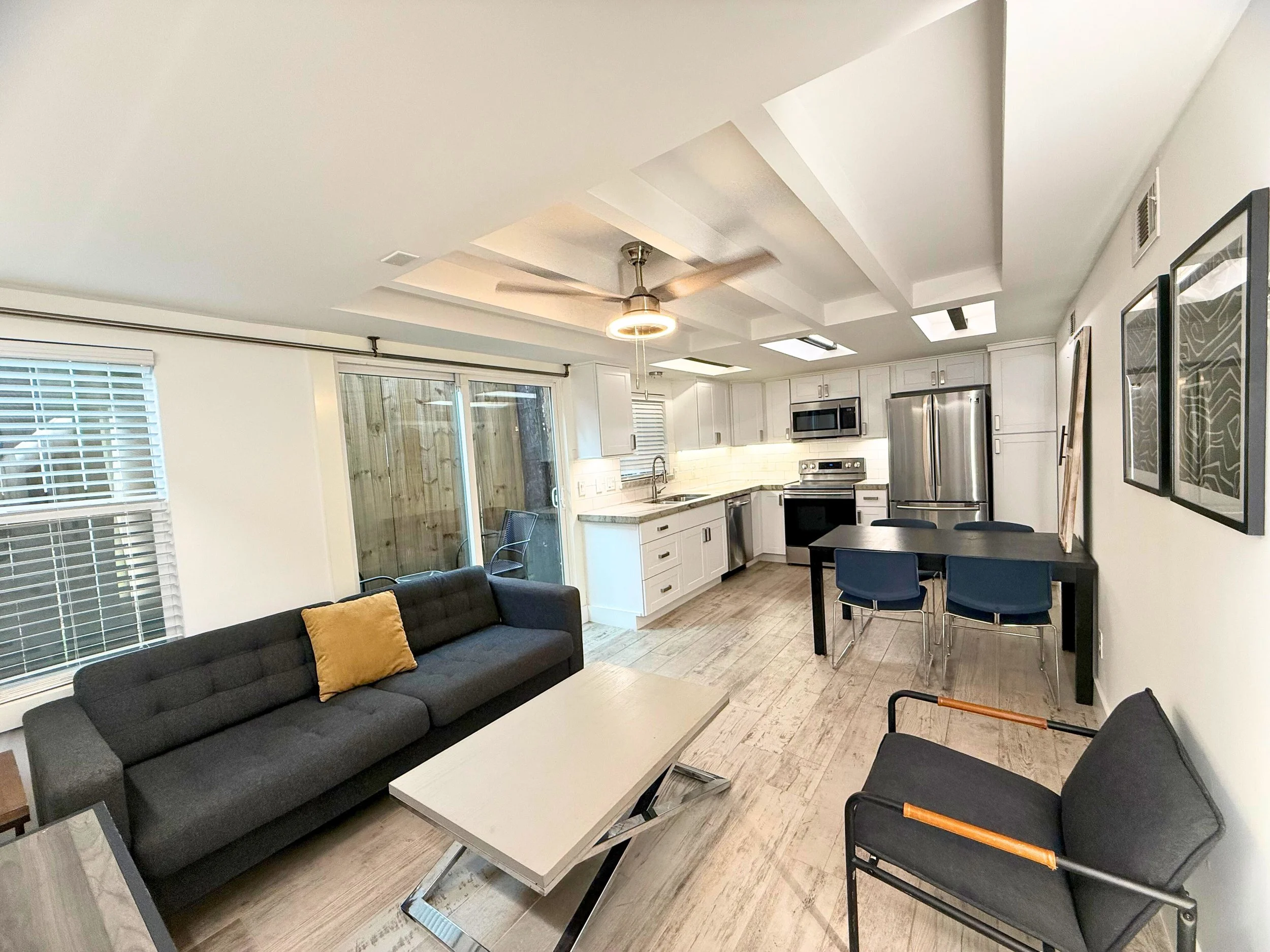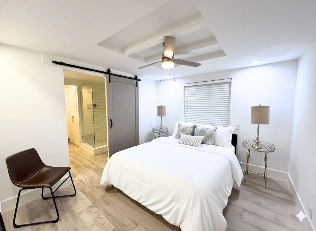 This ground-floor apartment (no stairs) features a sleek layout including 1 bedroom with a King bed, a full bathroom with a soak bathtub and walk-in shower, and an in-unit washer and dryer. Optimized for extended stays of 30 nights or longer, this pet-friendly property offers a peaceful haven for medical patients, corporate travelers, and those needing temporary housing.