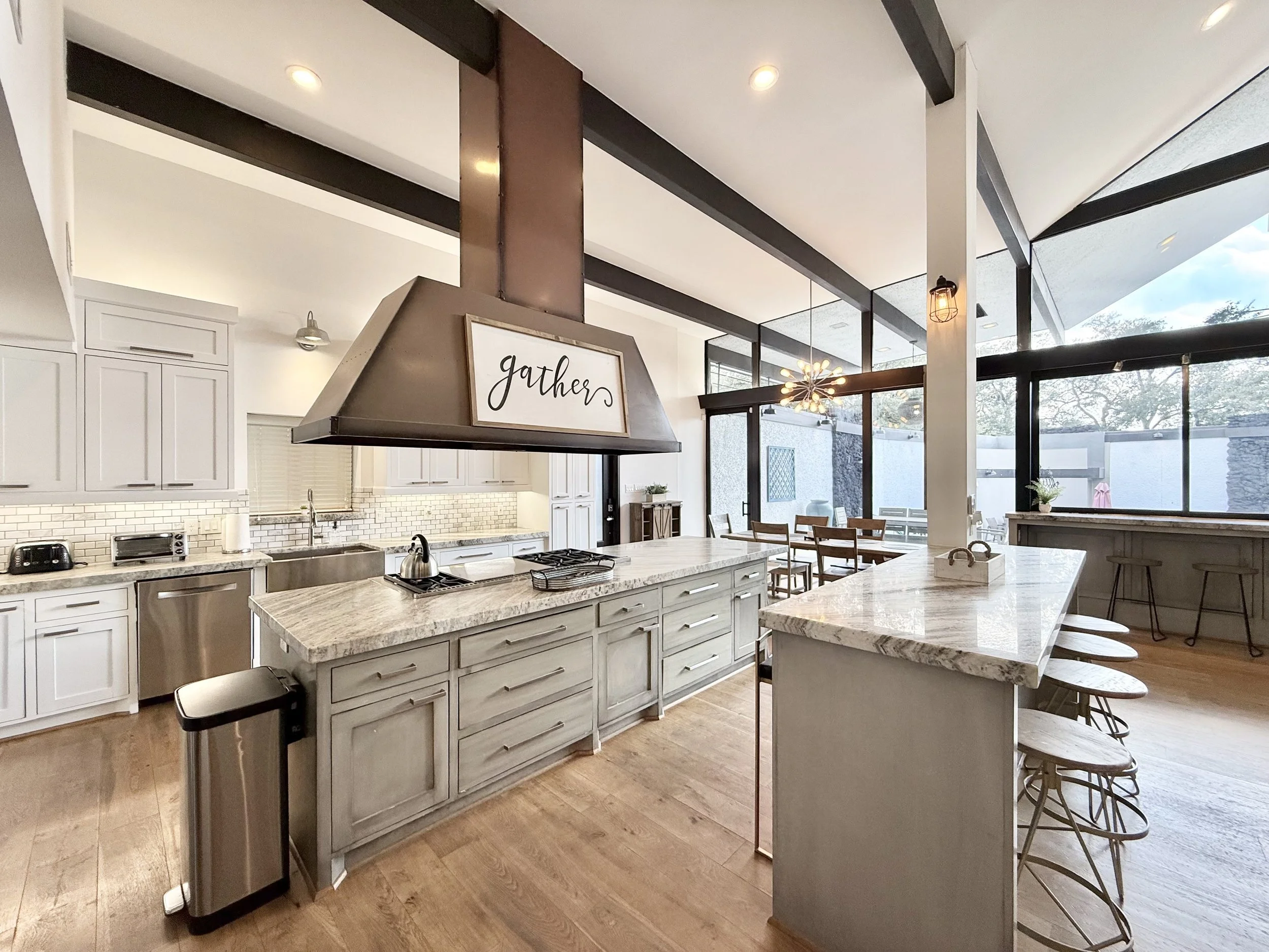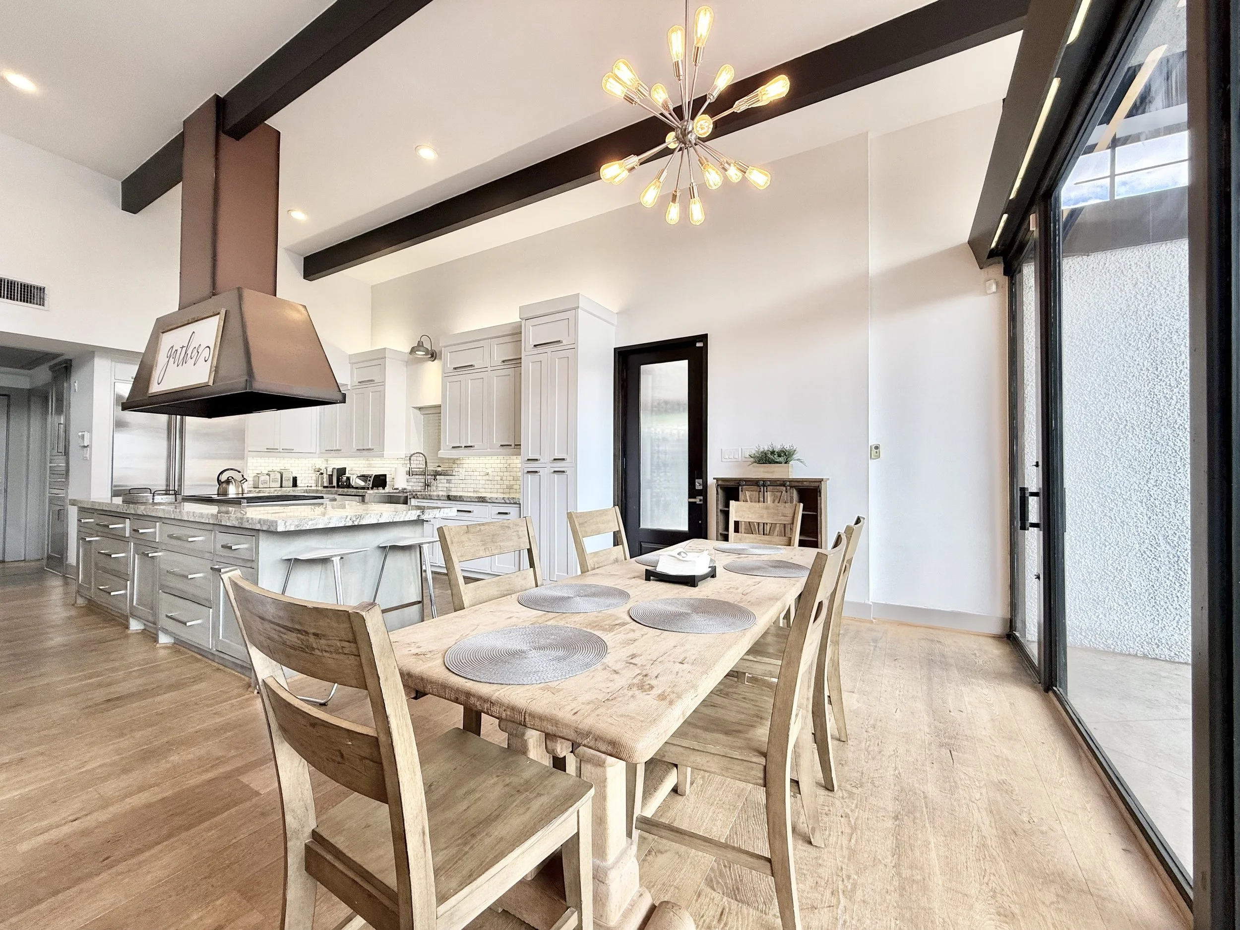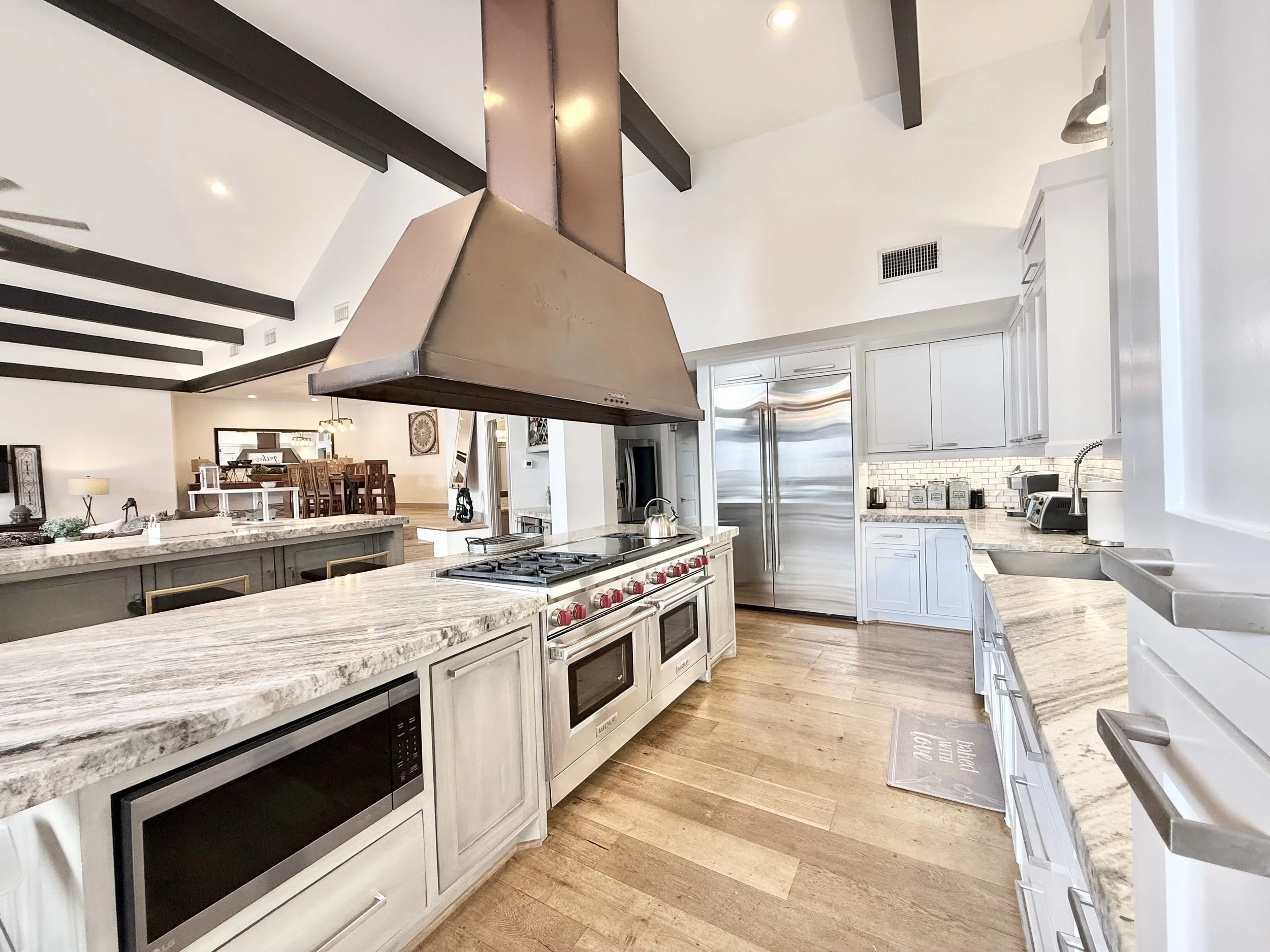 This stately two-story residence features a grand open layout with high ceilings and premium finishes throughout. The chef’s kitchen is fully equipped for long-term comfort, flowing seamlessly into multiple living areas that cater to both large families and professional groups needing room to spread out.